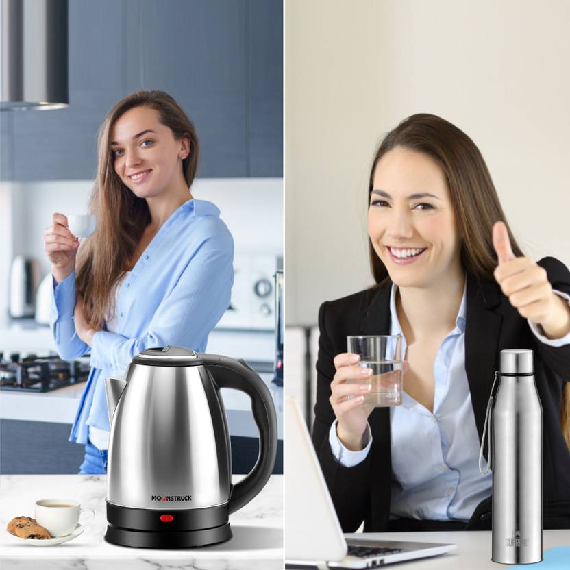 Moonstruck 1500W Fast Heating 1.8L Stainless Steel Electric Kettle with Auto Cut-Off + 1L Stainless Steel Bottle