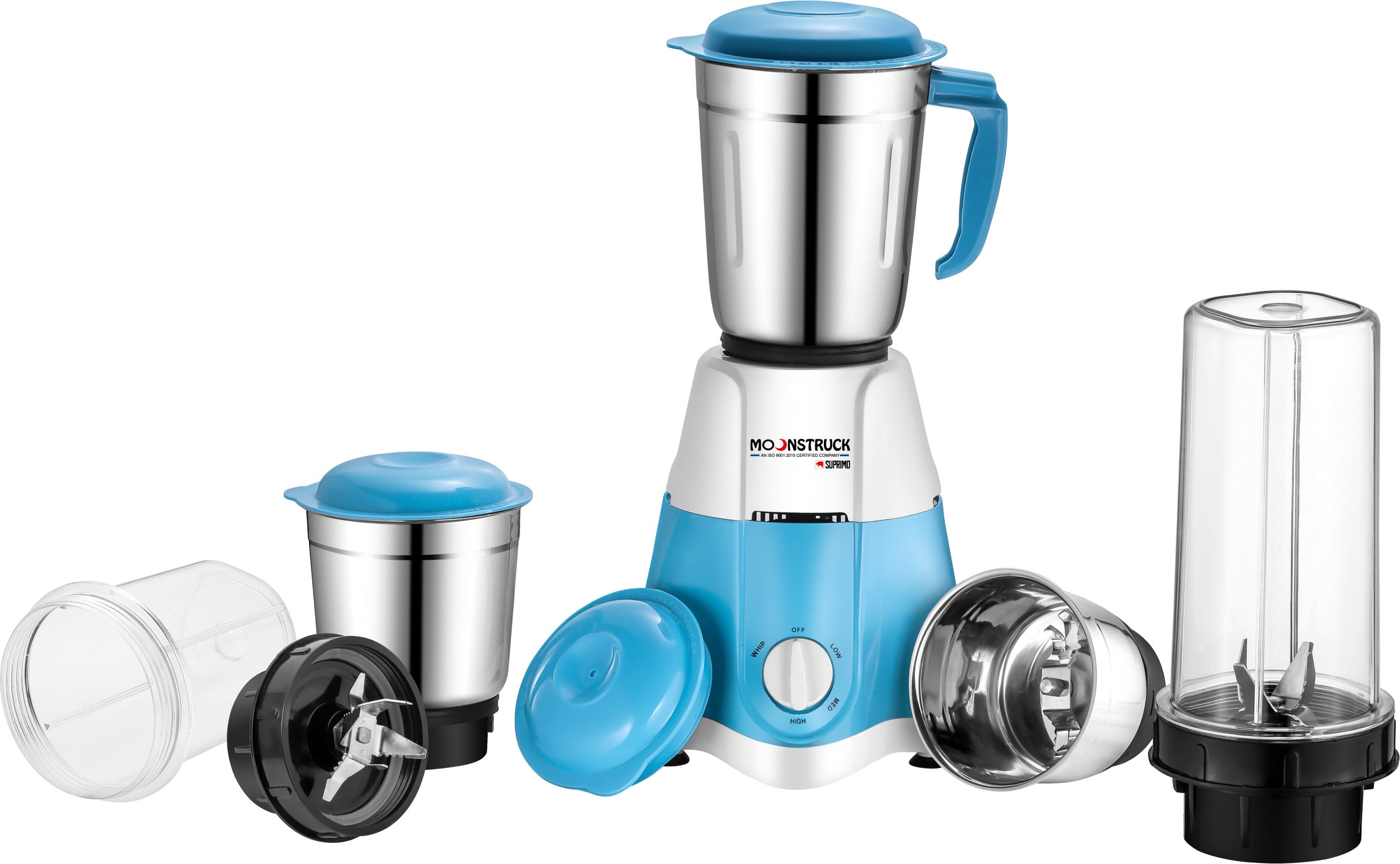 Elevate your culinary adventures with the Moonstruck Star Blue Juicer Mixer Grinder – a powerhouse of efficiency and versatility! This robust appliance boasts a powerful 750-watt motor, ensuring seamless blending, juicing, and grinding for a variety of culinary delights. The Star Blue model not only delivers exceptional performance but also adds a touch of elegance to your kitchen with its vibrant Blue hue. ?5 Jars for Ultimate Versatility:** This juicer mixer grinder comes equipped with a set of five jars, making it your all-in-one kitchen companion. The collection includes a large liquidizing jar for refreshing juices, a sturdy grinding jar for spices and coffee beans, a compact chutney jar for flavorful accompaniments, and two additional jars to cater to various culinary needs.